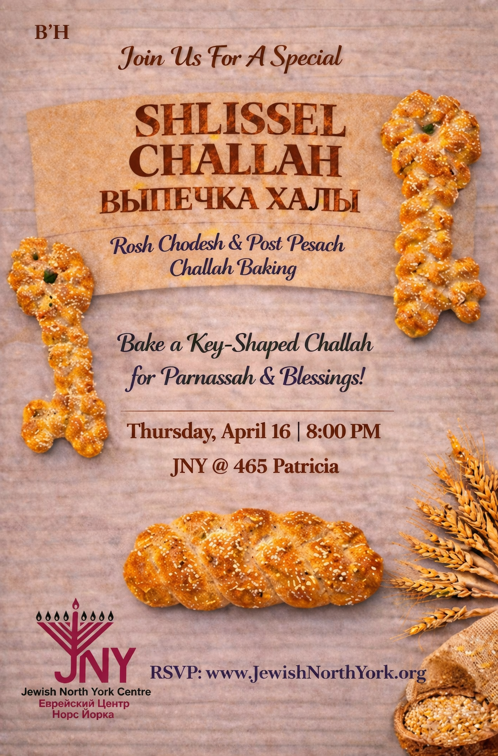 Dear Ladies! Baking Challah after Pesach is a Segulah for livelihood - parnasa. Please join us for a Special post Pesach Challah Baking Also known as "Shlissel Challah" Thursday, April 16, 8:00 pm at JNY - 465 Patricia Ave